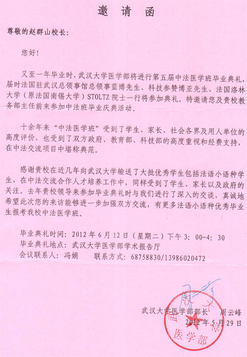 武汉大学医学部部长周云峰教授邀请我校赵群山校长参加第五届中法医学班毕业典礼