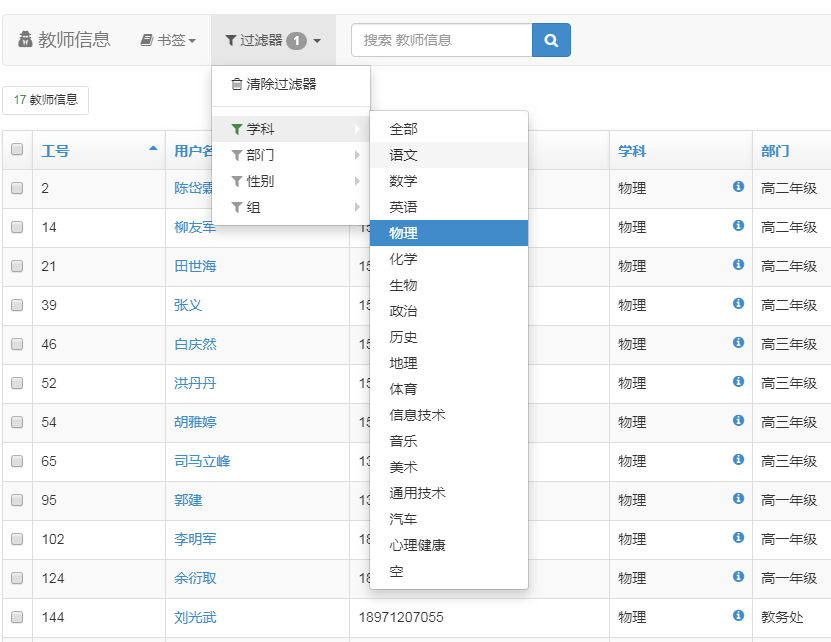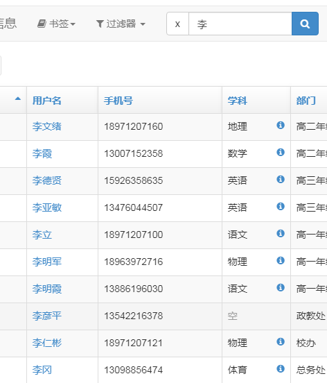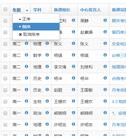 4.信息的排序:点击表头“年级“可以进行排序操作,可以正序或倒序