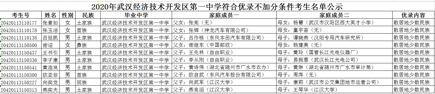 2020年武汉开发区一中符合优录加分条件考生名单公示