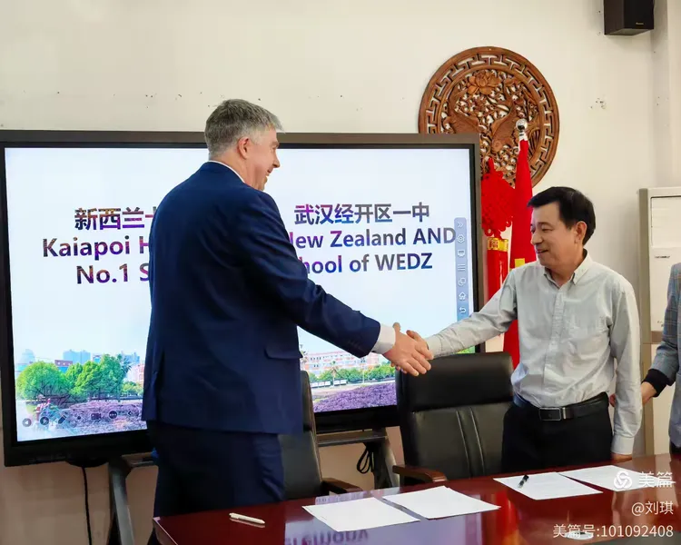 会议最后,在局领导大力支持下,武汉经开区一中教育集团党委书记刘建祥同志和新西兰卡亚波伊高中Jason Reid校长在两校合作协议上达成了共识。