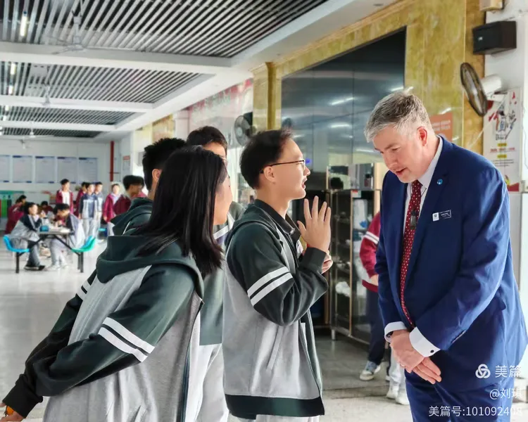 最后外宾在周局、田主任、冉校、龚主任的陪同下参观了校园,Reid校长和白宇主任赞叹我校优美的校园环境和优质的教学软硬件,也“入乡随俗”地在食堂同老师们一起用餐。特别值得一提的是,在参观学生食堂时与我校三个年级部分学生进行了热烈的交谈,他们自信大方,表现优异,这也展示出开一学子“面向世界,心向未来”的精神风貌!
